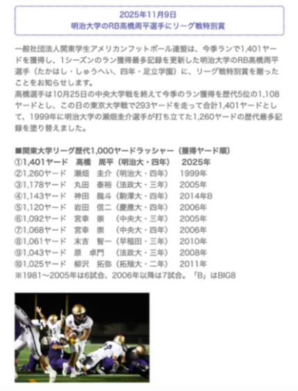 また、明治大学の高橋周平選手はこの試合で今季、歴代最多記録(1,260 ヤード)を更