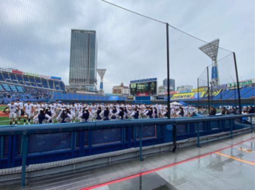 の試合応援に横浜スタジアムへ伺いました。当日はあいにく雨模様で集合場所には